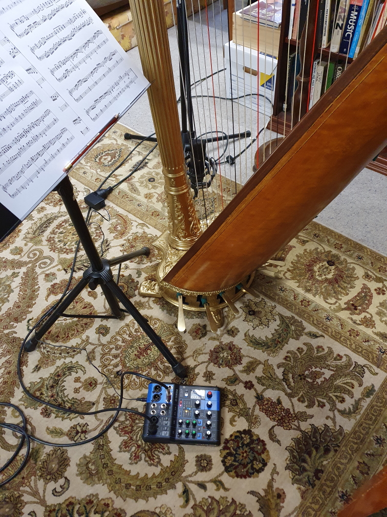 I have now added a small mixing board to my set up and a speaker instead of an amp. This is also working really well and I like having a little more capability to adjust my sound. I recently had to amplify an historic harp for a performance. I didn’t want to put any kind of mic on the harp so I used an external mic (Rode NT1). Here are some pictures of my set up: